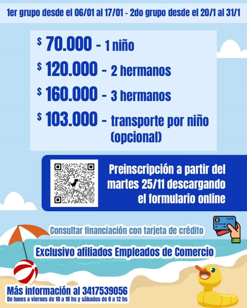 A partir del martes 25 de este mes se podrán preinscribir a los chicos que quieran participar de la tradicional Colonia de Vacaciones 2026, en el Campo de Deportes de Ricardo Núñez 390, destinada a menores de 4 a 12 años de edad que sean exclusivamente hijos de compañeros afiliados.