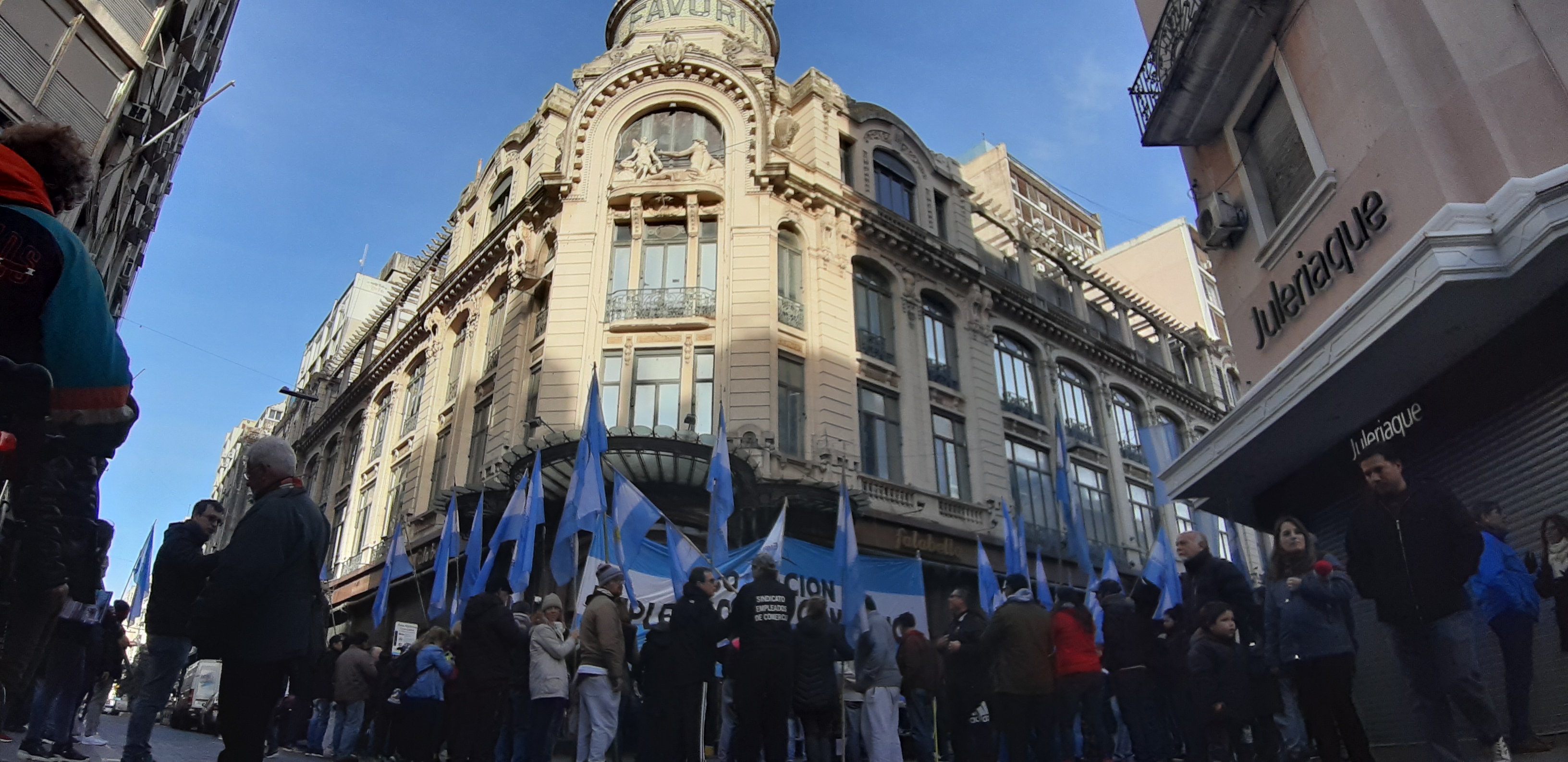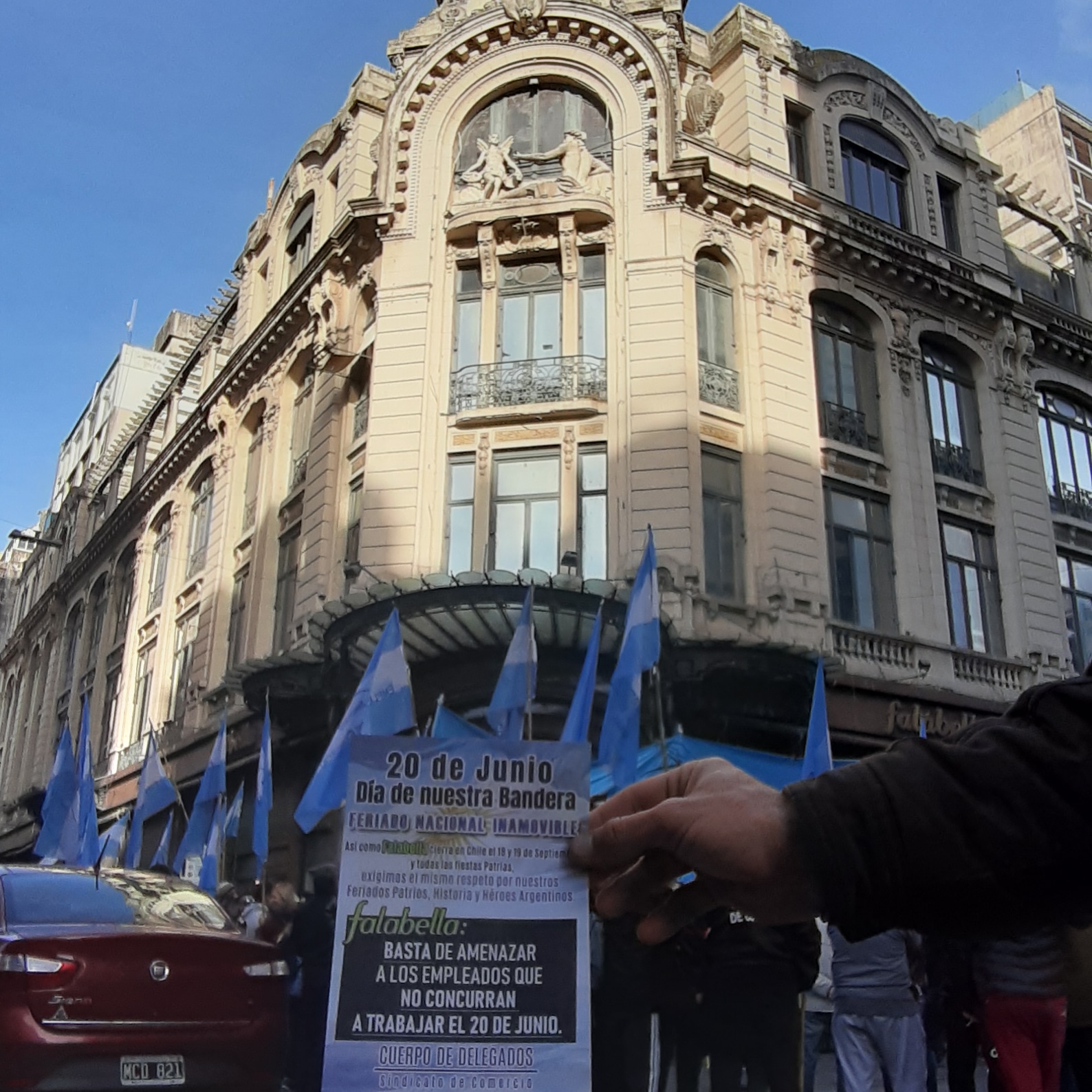 La convocatoria en esa esquina no fue por casualidad. La elegimos porque allí hay una gran tienda de capitales chilenos y los dueños, en su país de origen, respetan y celebran sus fiestas patrias, pero acá no quieren hacerlo y amenazan a los trabajadores mercantiles que desean adherir al Día de la Bandera y no ir a trabajar, con descuentos, aprietes y otras acciones propias de los vendepatria.