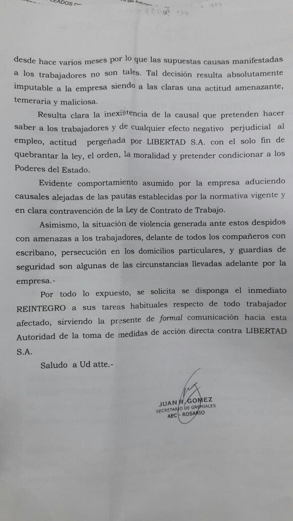 En la mañana de hoy ya exigimos, en el Ministerio de Trabajo de la provincia, la inmediata reincorporación de los trabajadores, e hicimos expresa reserva de llevar a cabo acciones gremiales en caso de que la situación no sea revertida.