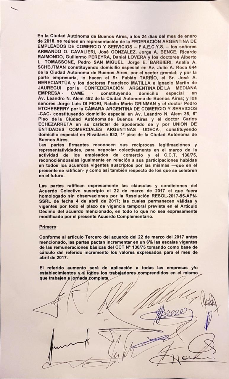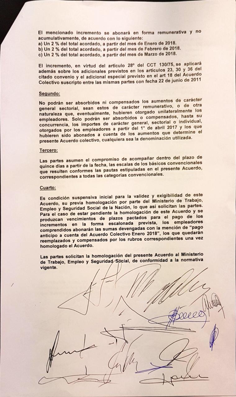 Ese 6% se aplicará sobre el salario básico de abril de 2017, y de esta forma se completa una paritaria anual de marzo 2017 a marzo 2018 de 26%.
